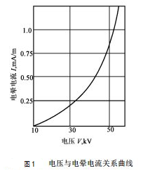在相同條件下,電壓越高,在接地極(鼓筒面或平面)上的電暈電流也越大,其關系曲線如圖1所示。