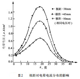 極距也是嚴重影響電暈放電電流的重要因素,在相同的電壓下,極距越小,電流越大,亦即電流隨極距的增加而減小,其關系曲線如圖2所示。